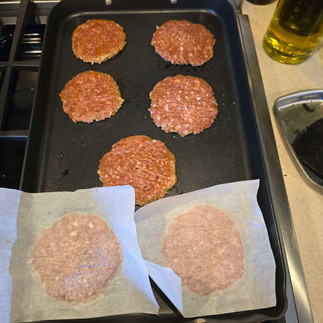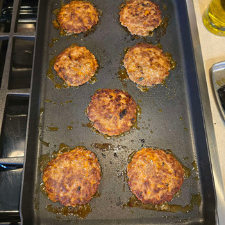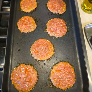 One pound of the mixture made about seven patties. I took balls of meat a little larger than a golf ball, placed them on square pieces of parchment paper, covered them with another piece of paper, and Elena and Ivan pressed down on them with a salad plate so they were flattened into patties. I then quickly removed the top sheet and inverted it onto a hot griddle at low heat and cooked for about 4 minutes on the first side until browned (and the top-side edges looked cooked a bit). Once the patties cooked for a minute or two on the first side, the parchment paper was easily peeled off the top of each patty without taking meat with it.